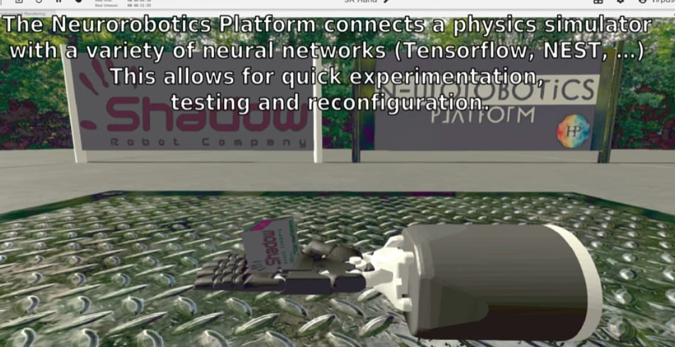 The Shadow Hand can now be simulated within HBP’s Neurorobotics Platform: The platform connects a physics simulator (either ODE or Simbody) to a variety of brains or neural networks, implemented via Tensorflow, NEST and Nengo.