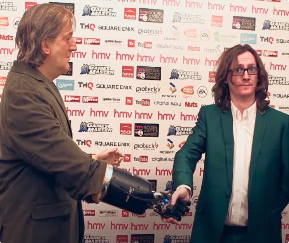 The Shadow Hand featured as part of a lifelike robotic avatar of Stephen Fry which he controls via the internet. Stephen sends his robot clone to present an award at the 30th Golden Joysticks Video Game Awards, allowing him to stay in the comfort of his own home. It was produced by North One Production Company for Channel 4.